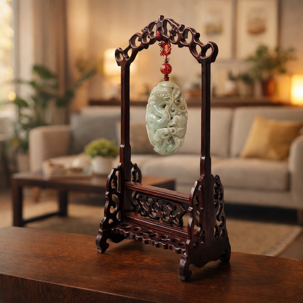 以祥龍守護意象結合天然翡翠雕刻設計,象徵鎮宅守護、凝聚財氣與穩定能量場,為居家與辦公空間注入平安、順利與長久守護的祝福。