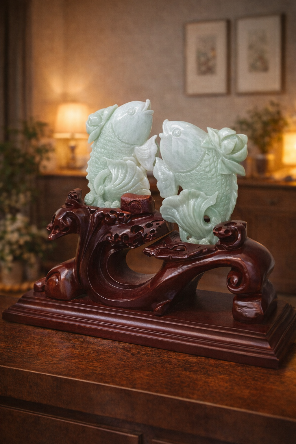 以象徵「年年有餘」的翡翠雙魚雕刻設計,寓意財運循環、富足累積與家庭圓滿,為居家與辦公空間帶來穩定財氣與長久順遂的祝福。