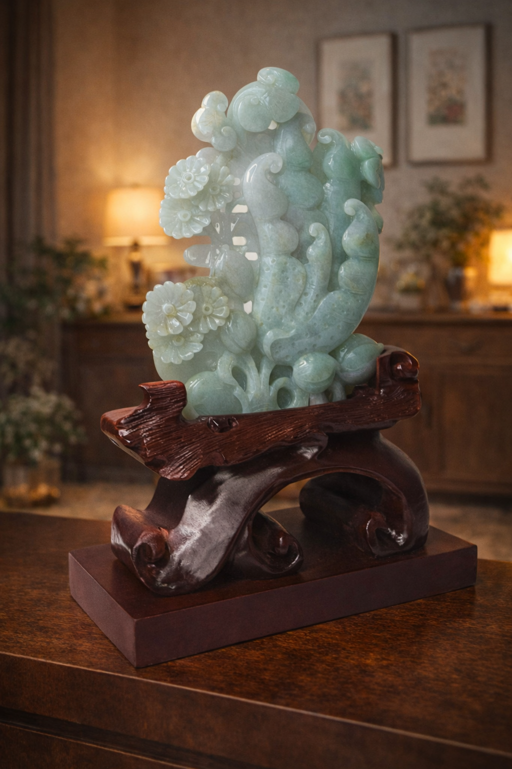 以象徵花開富貴與萬事如意的翡翠雕刻設計,寓意福氣綻放、順心發展與能量穩定,為居家與辦公空間帶來吉祥圓滿與長久祝福。