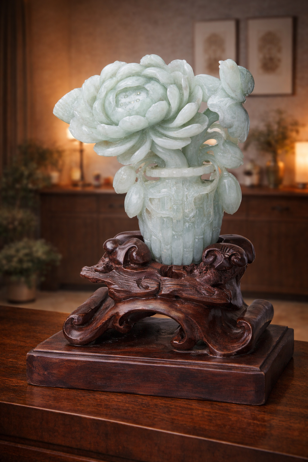 此件「年年富貴・翡翠牡丹如意花瓶風水擺件」,以天然緬甸玉精雕層層盛開的花朵與如意流線造型,展現溫潤細膩的工藝之美,也象徵吉祥能量在空間中持續循環。於咕咕好運 GoodGoodLuck 的祝福理念中,翡翠代表五行能量中的穩定與平衡,透過象徵性補運意涵,協助調整生活節奏與空間氣場,使心境更加安定,讓好運自然靠近。