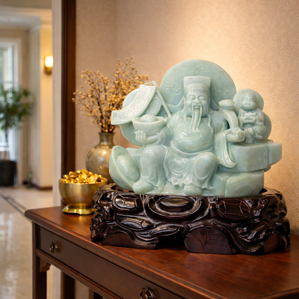 以緬甸玉雕刻財神端坐福祿寶座,手持元寶與財卷,象徵聚財納福、財庫穩固與家運興旺,適合玄關、客廳與商空財位擺放,提升空間招財能量。