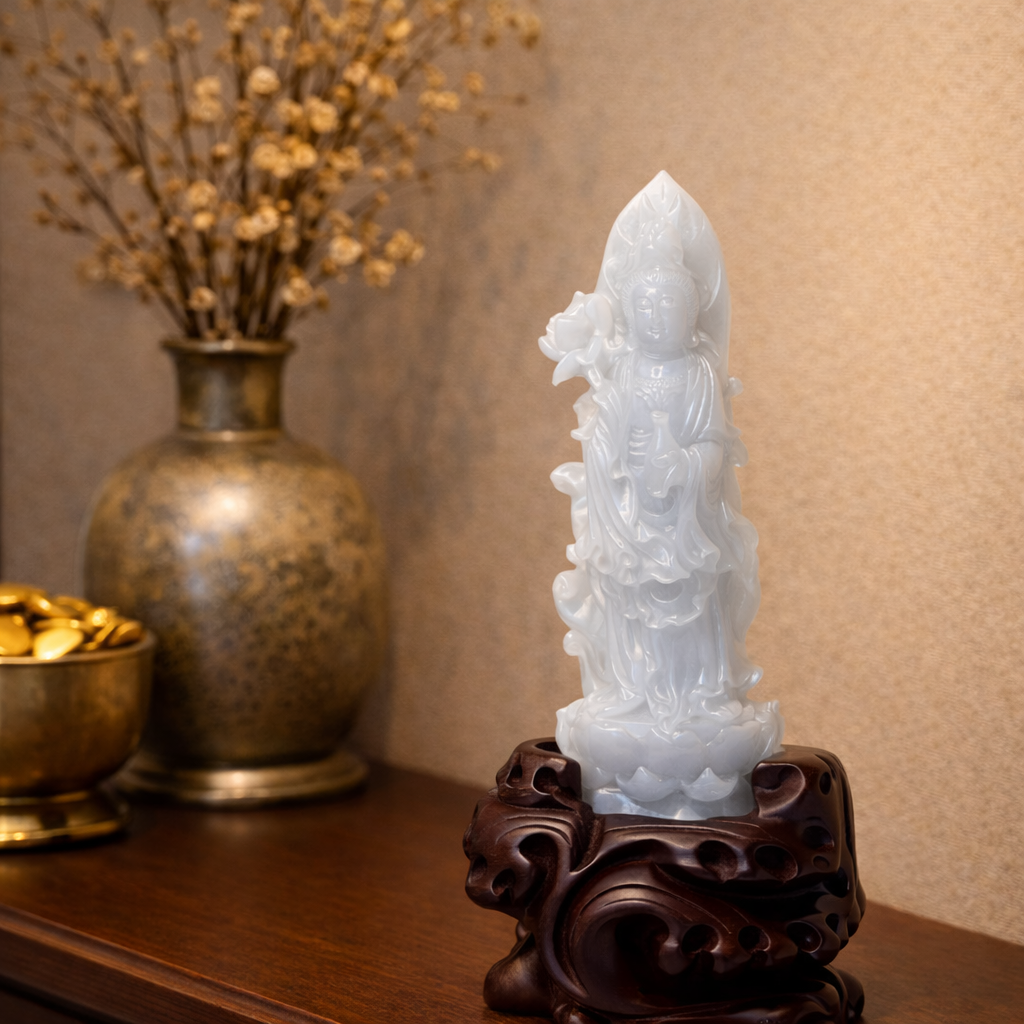 以天然緬甸玉精雕觀音立像,象徵慈悲守護、心境安定與空間淨化,為玄關與居家環境注入平靜柔和的守護能量。